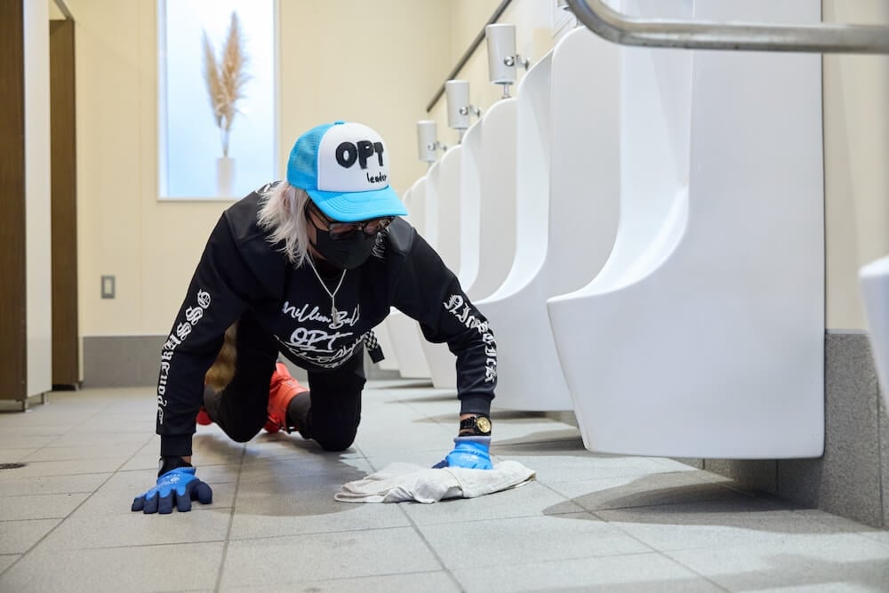 大井:はいつくばって、ごしごし磨いている姿を見てもらうことです(笑)。OPTではあまり大きな清掃機械や柄の長いモップ、ブラシは使わずに、床に膝を着けて手作業で磨いていきます。僕たちがタイル1枚、溝1本も逃さずに磨いている姿を見ると、「これは汚せない」と皆さん思うはずです。