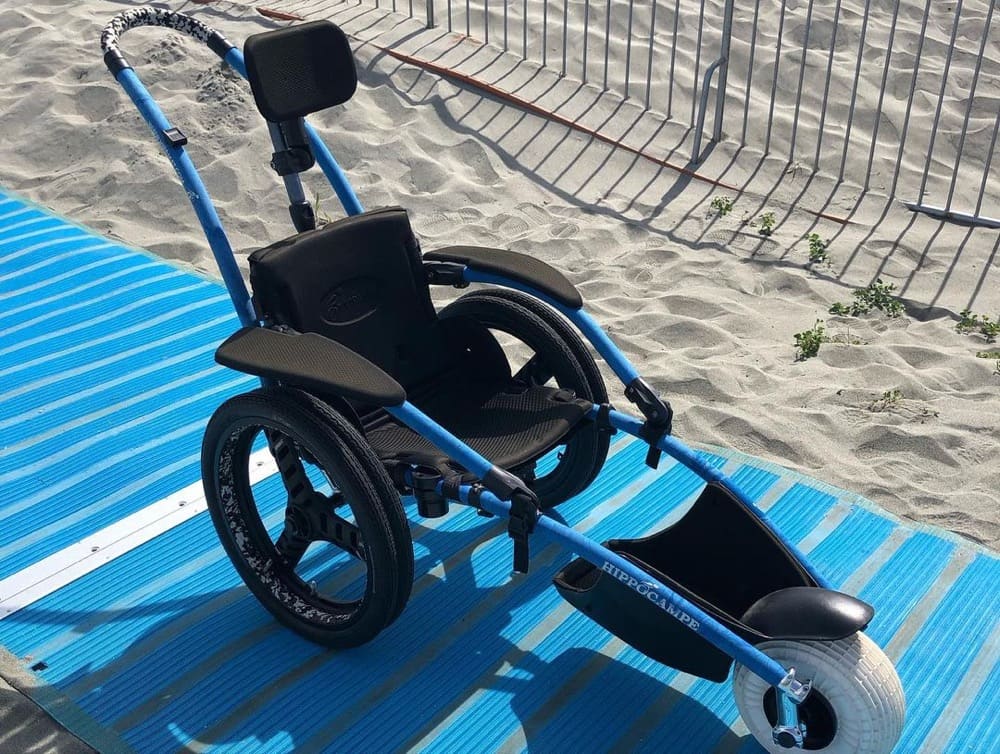 木戸:まずは車輪が砂にのまれないようビーチマットが必要になります。マットを敷いて波打ち際まで行けるようになると、「海に入りたい」という気持ちにもなりますので、水陸両用のアウトドア用車いす「ヒッポキャンプ」というものも用意しています。