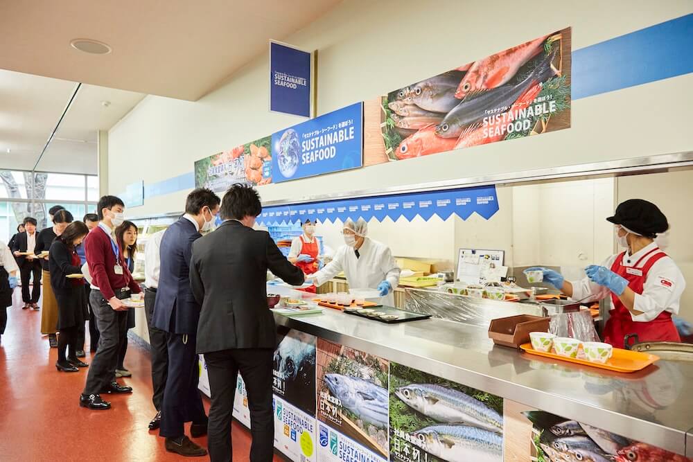 また、2018年には日本で初めて社員食堂(外部リンク)での「サステナブル・シーフード」の定期的・継続的な提供を開始。2024年1月現在、同社の57拠点で実施されており、海を取り巻く社会問題の理解促進や、「サステナブル・シーフード」を選んで食べることによる従業員を起点とした消費行動の変革を促しています。