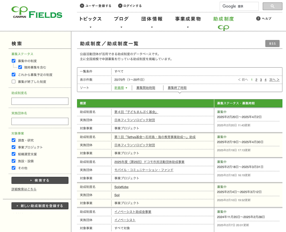 これから募集予定の助成金情報も掲載しているため、幅広く情報収集ができることも利点といえる。
