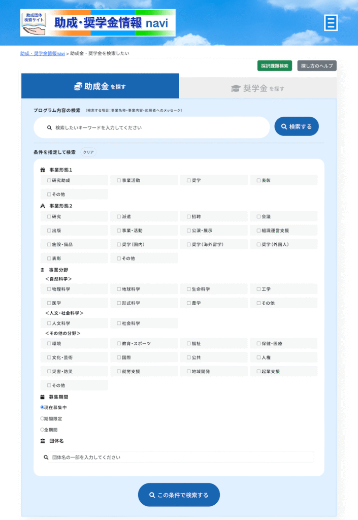 助成金の募集情報の検索サービスでは、「研究」や「事業・活動」「組織運営支援」といった事業形態や「保健・医療」「環境」「教育・スポーツ」といった事業分野、「募集期間」などの条件を指定して検索できる。