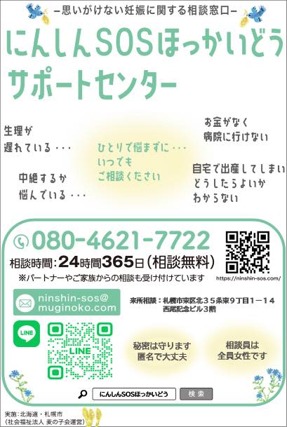 また、2020年からは予期しない妊娠や望まない妊娠などにより悩みや不安を抱えた妊産婦の方々が相談できる窓口として「にんしんSOSほっかいどうサポートセンター」(外部リンク)を運営しています。