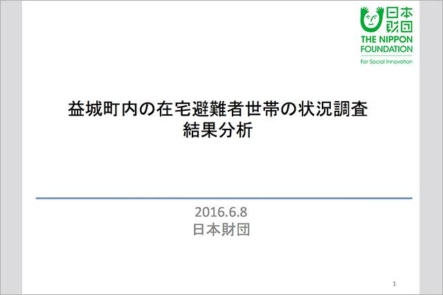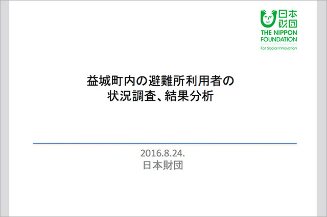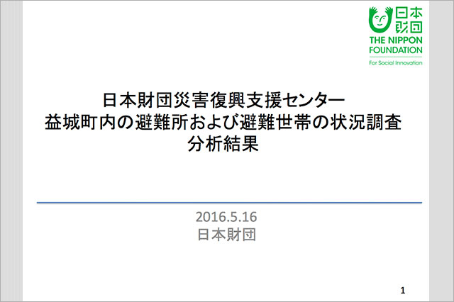 日本財団は、熊本地震による被災者の避難生活における被害拡大を防ぐことを目的に、益城町内にて、1,243世帯(3,195人)への聞き取り調査を実施。調査結果と今後の取り組みを発表しました。