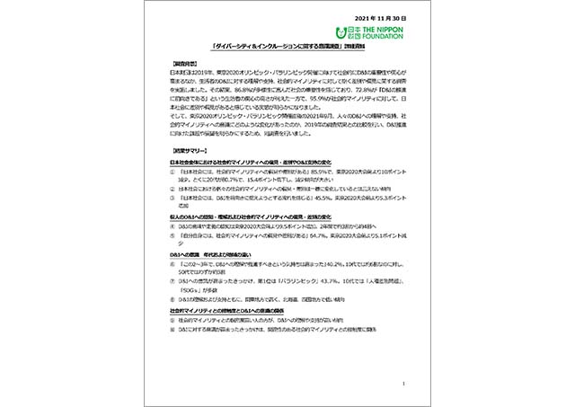 日本財団は、東京2020オリンピック・パラリンピック開催前後(2019年と2021年)における、ダイバーシティ&インクルージョン(以下、D&I)の認知や理解、および社会的マイノリティに対する意識の変化を明らかにするため、10代~60代の男女、5,216人を対象に調査を行いました。