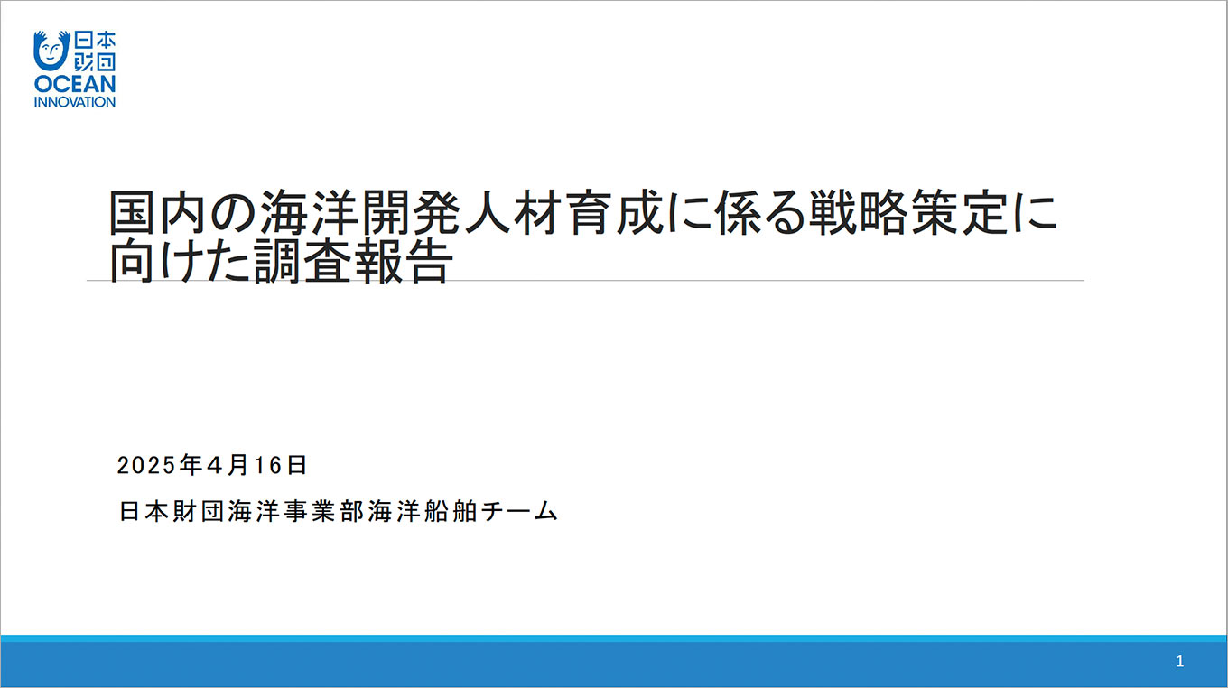 日本財団では海洋開発に関わる技術者育成を産学官を挙げて推進しています。今後の市場展望とそれに応じた必要人材の要件や育成の在り方等を検討する調査を実施しました。
