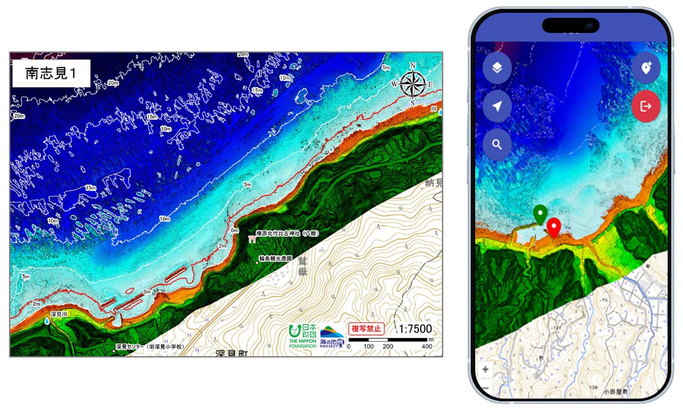 紙版「海の地図」のイメージ(画像左)、スマートフォン版「海の地図」のイメージ(画像右) 日本財団と日本水路協会(東京都品川区、理事長 藤田雅之)は、日本全国の浅海域を測量・地図化する「海の地図PR