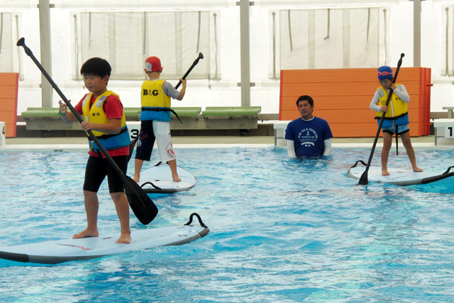 スタンドアップパドルボード体験 日本財団は、岡山県内の避難所(真備・矢掛・井原)の子どもたちを、瀬戸内市邑久B&G海洋センター施設でのプールアクティビティへ無料招待(バス送迎あり)いた