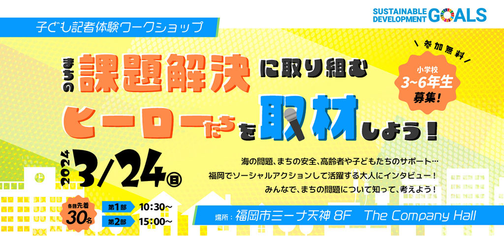 ※各回定員に達しましたので、申し込みを締め切らせていただきました。 2024年3月24日(日)にミーナ天神(福岡市)で実施する「子ども記者体験ワークショップ:まちの課題解決に取り組むヒーロ