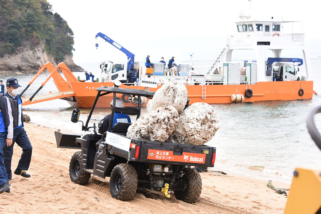 上陸用舟艇・特殊車両・減容装置など活用 離島海岸に散乱する大型漂着ごみ1.2トンを一掃