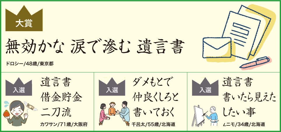 第7回「ゆいごん川柳」大賞決定 「無効かな 涙で滲む 遺言書」