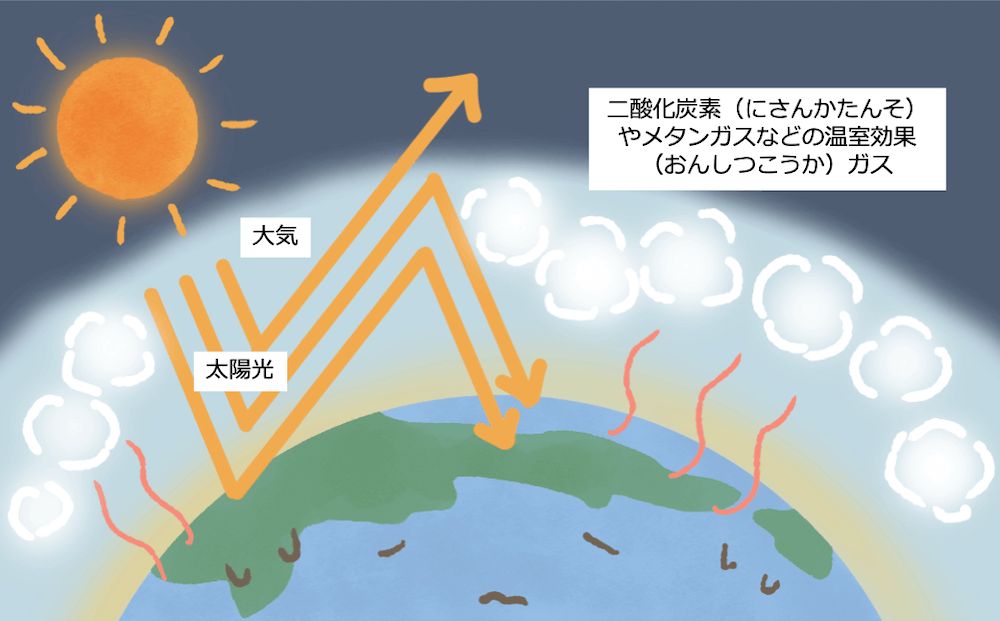 そもそも地球の気温は、温室効果(おんしつこうか)ガスが熱(ねつ)をためこむ性質(せいしつ)を持っているので一定に保(たも)たれています。ところが、人間の活動によって温室効果(おんしつこうか)ガスが増(ふ)え過(す)ぎると、熱(ねつ)をためこみ過(す)ぎて気温が上がってしまうのです。