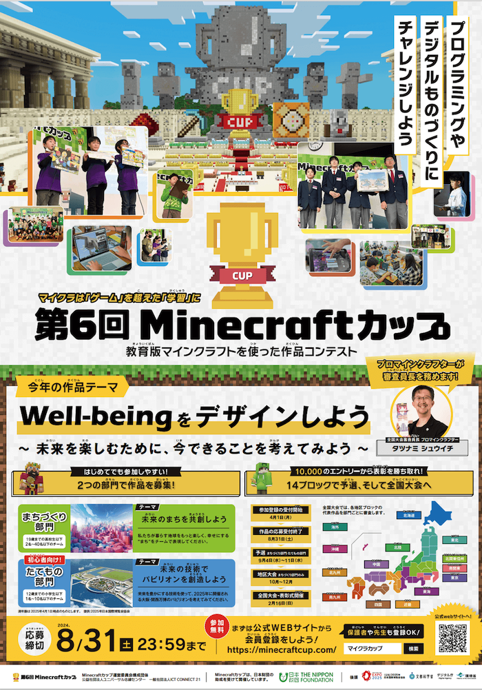 今回作った作品をベースに、「マインクラフトカップ」にチャレンジすれば、自由研究の学びがより深いものになります。第6回大会の作品の受付は20024年8月31日(土)まで。応募方法(おうぼほうほう)や大会参加(たいかいさんか)の流れなどは、公式(こうしき)サイトでご確認(かくにん)してください。