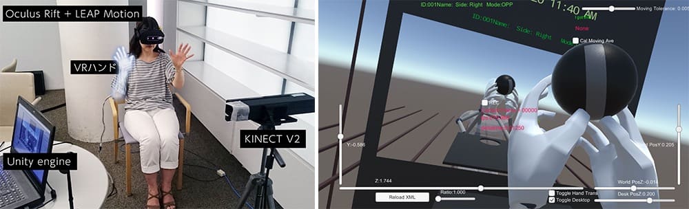 赤外線カメラで動く方の肢の動きを撮影し、リアルタイムで動かせる3DCGにします。さらにそれを反転することで、幻肢の3DCGも生成。幻肢が左右対称でない患者さんの場合は、その日の幻肢の状態に合わせ、VR空間内で位置調整ができるようプログラムされています。
