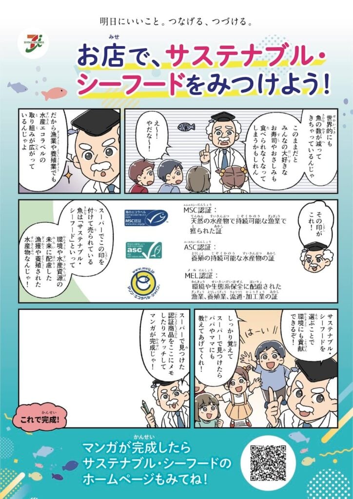 「MSC認証」や「ASC認証」を取得した漁業、養殖業で生産された「サステナブル・シーフード」の販売をしているほか、特設サイト(外部リンク)を設けて商品やレシピの紹介、動画やマンガ、クイズを展開して「サステナブル・シーフード」の認知度向上を図っています。
