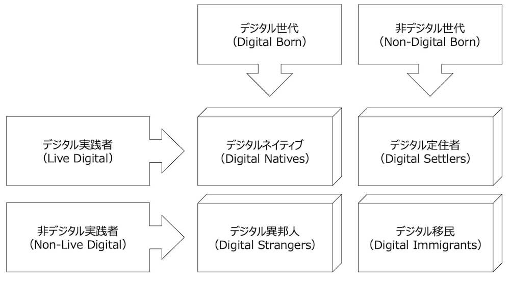 これまでの生活の中で、デジタル世界を経験することがなかった人たちを意味する。このデジタル移民は、デジタルリテラシーを習得することによって、デジタル定住者へとなりうる。