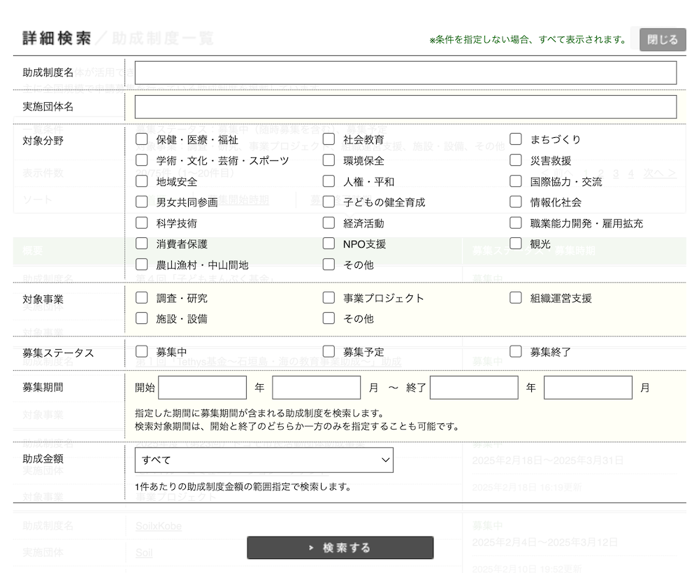 サイトのメニューにある「助成制度」(外部リンク)では、「新着順」「募集開始時期」「募集終了時期」で、助成制度の情報が閲覧できるほか、詳細検索では、「助成制度名」「実施団体名」「対象事業」「募集期間」「助成金額」など、豊富な選択肢の中から絞り込んでの検索も可能だ。