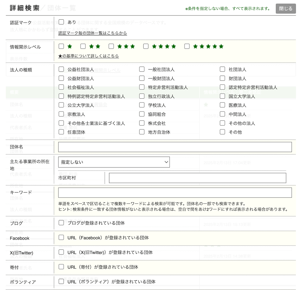 メニュー「団体情報」にある検索機能では、情報開示レベルや、ブログやSNSの実施有無、ボランティア情報なども絞ることができるのも便利だ。