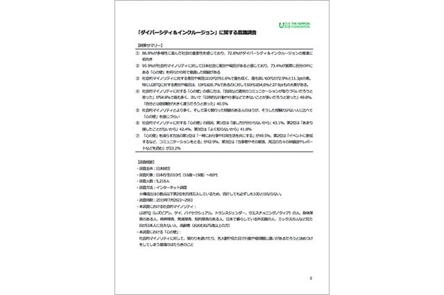 日本財団は、東京2020オリンピック・パラリンピック開催前後(2019年と2021年)における、ダイバーシティ&インクルージョン(以下、D&I)の認知や理解、および社会的マイノリティに対する意識の変化を明らかにするため、10代~60代の男女、5,216人を対象に調査を行いました。