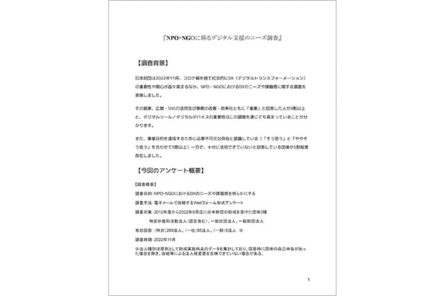 日本財団は2022年11月、コロナ禍を経て社会的にDX(デジタルトランスフォーメーション)の重要性や関心が高まるなか、NPO・NGOにおけるDXのニーズに関する調査を実施しました。