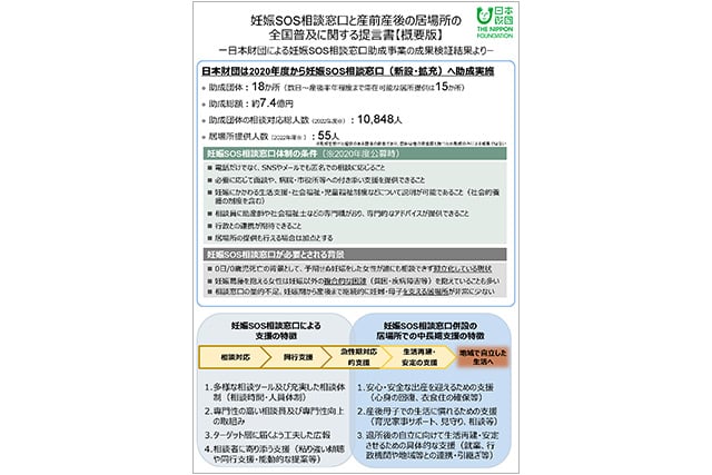 日本財団は妊娠SOS相談窓口助成事業の成果を検証するとともに、現状の課題及び今後の改善点に係る調査分析を行い、「妊娠SOS相談窓口と産前産後の居場所の全国普及に関する提言書」を公開いたしました。