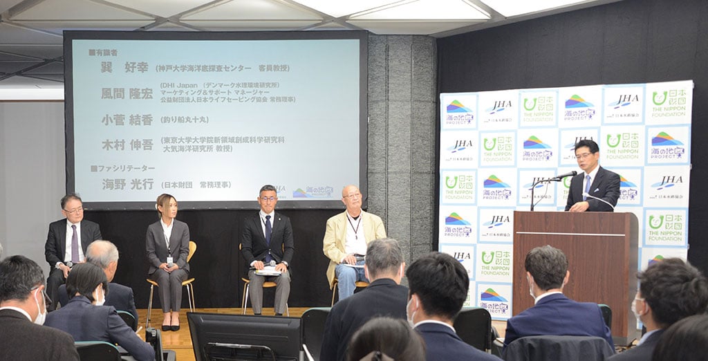 会見の様子 日本財団と日本水路協会(東京都大田区、理事長 加藤茂)は、日本初の取り組みとなる、日本全国の海岸につづく浅海域(水深0〜20m)の90%を航空測量し、地図化する「海の地図PROJECT