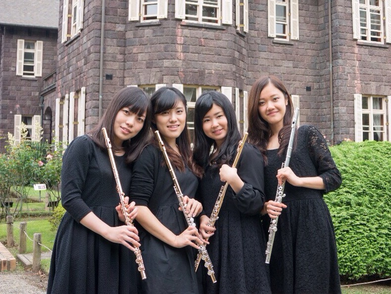 出演者 左から、江黒奏美、鈴木菜月、黒田静葉、田村桃子 Flute Quartet émiris 江黒 奏美(えぐろ かなみ)/ フルート 黒田 静葉(くろだ しずは)/ フルート 鈴木 菜