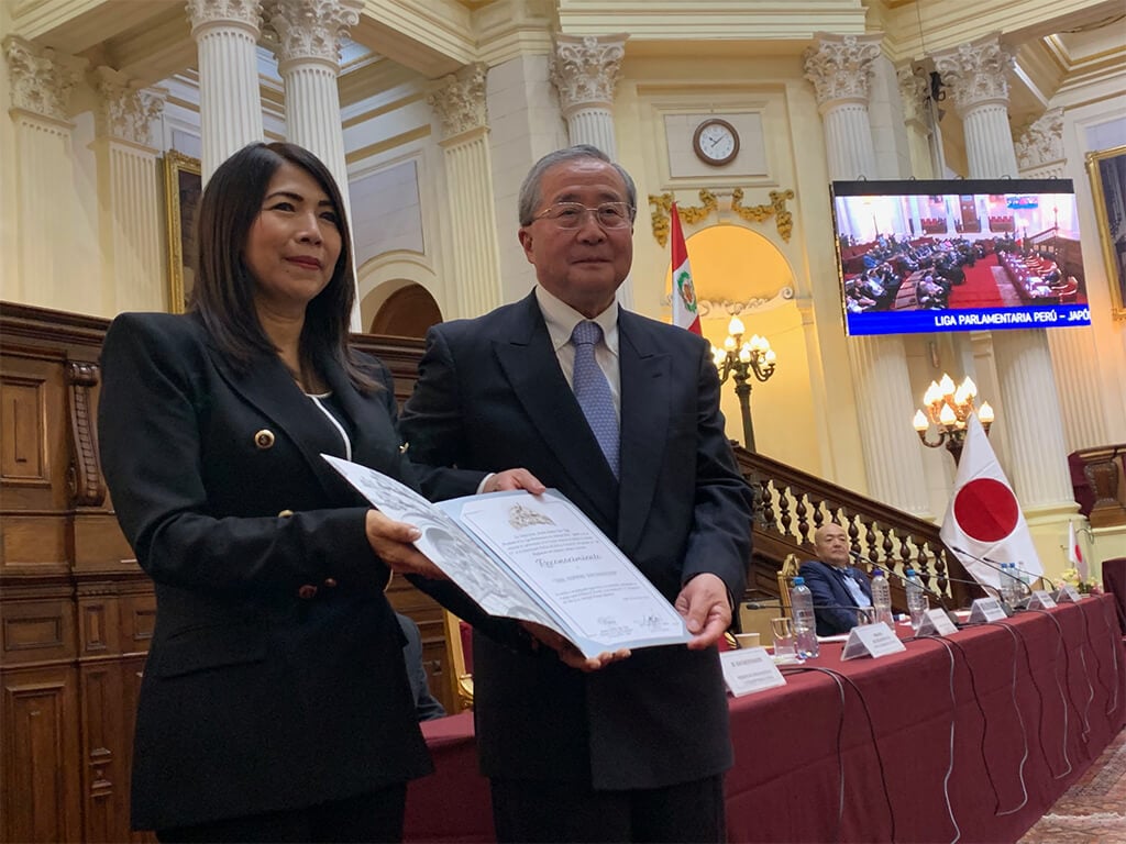 日本ペルー友好議員連盟会長のMaría del Pilar Cordero Jon Tay氏より表彰を受ける尾形理事長 日本ペルー友好の日34周年記念となる2023年4月3日、日本財団は日本ペルー