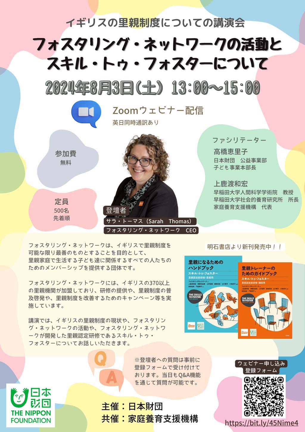 イギリスの里親制度についての講演会を開催します!講演では、イギリスの里親制度の現状やフォスタリングネットワークの活動について、また、フォスタリングネットワークが開発した里親認定研修であるスキルトゥフ