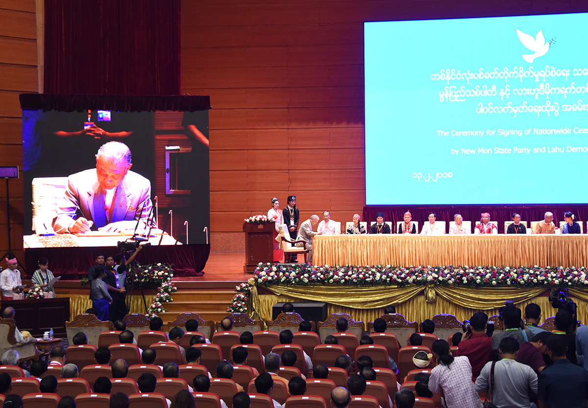 署名式の様子 ミャンマー政府と少数民族武装勢力の新モン州党(NMSP)とラフ民主同盟(LDU)は2月13日、首都ネピドーで停戦に合意、ミャンマー政府とNMSP並びにLDUの代表らによる停戦協定署名